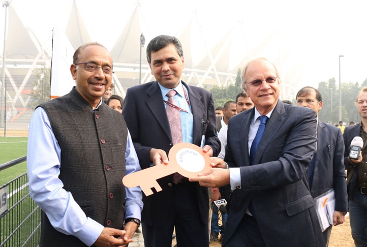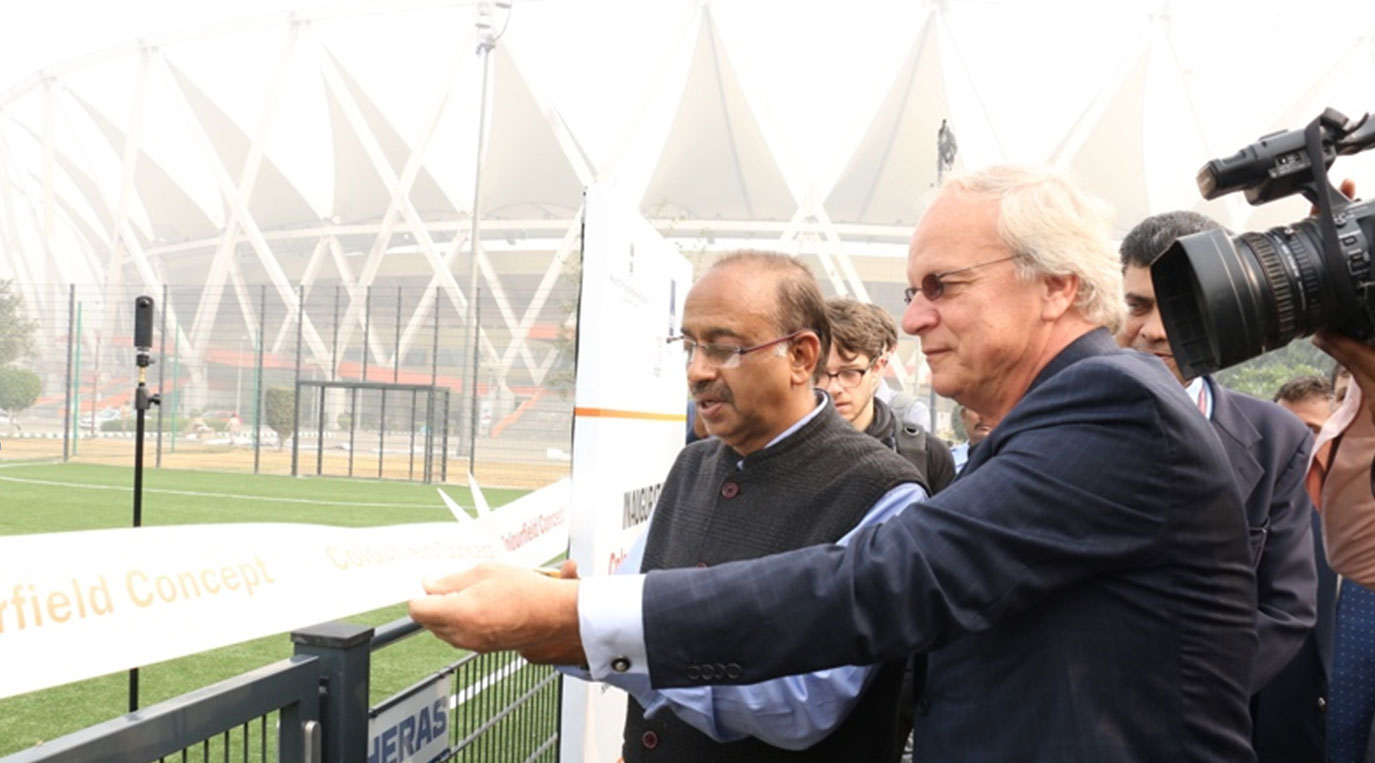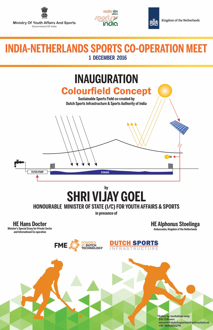 In a bilateral partnership between the Indian Government, the Dutch Government and a Dutch consortium of companies working under the organization Dutch Sports Infrastructure (DSI), India and the Netherlands launched the first Colourfield at JLN Stadium in New Delhi.